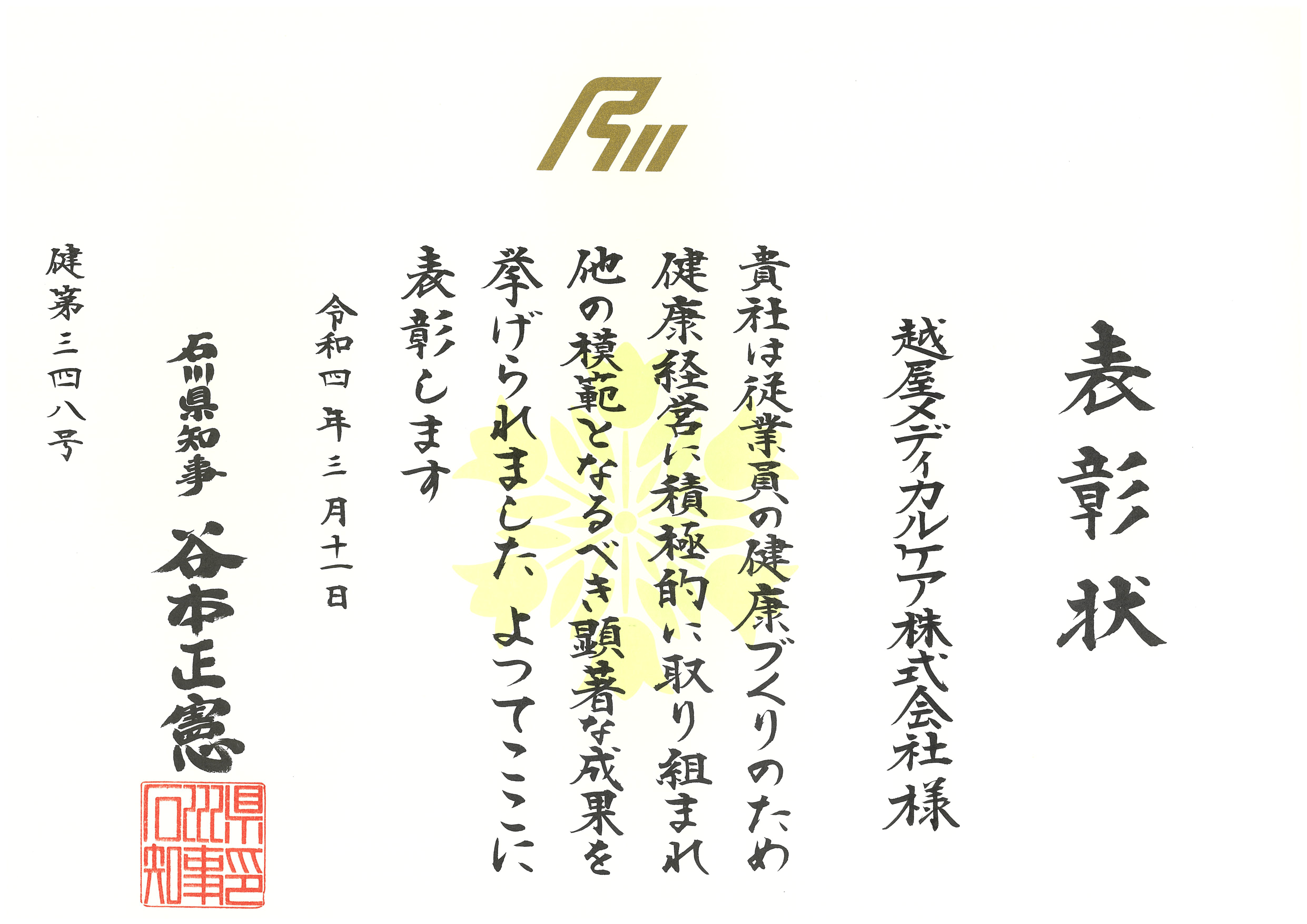 越屋メディカルケア株式会社は、令和4年3月11日に令和3年度「いしかわ健康経営優良企業知事表彰」を受賞しました。